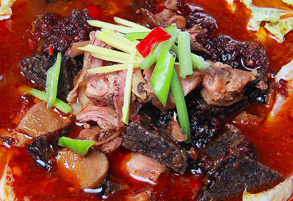 3、大約燉至90分鐘左右后,肉熟骨爛把已炸好的血粑及新鮮紅辣椒一起倒入鴨肉內,再用高火燉5至10分鐘,即可食用。