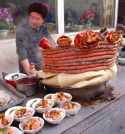 新疆盛產(chǎn)牛羊,是我國主要畜牧業(yè)基地之一。信仰伊斯蘭教的民族以食牛羊肉為主。牛羊肉風(fēng)味小吃名類繁多自不待言,就是以羊的內(nèi)臟作原料,也能烹制出鮮香異常的美味來。米腸子與面肺子便是其中的代表。