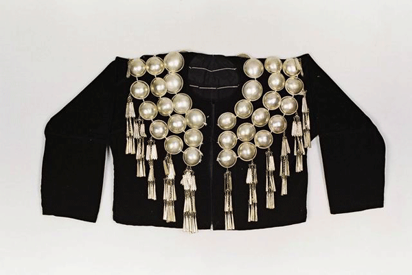民族文化宮博物館收藏的這件銀飾“孔雀衣”,是景頗族女子盛裝時(shí)的一種服飾,征集于云南省德宏傣族景頗族自治州隴川縣,時(shí)間為20世紀(jì)50年代。這件銀飾“孔雀衣”長(zhǎng)40厘米,胸圍108厘米,黑色平絨布制作而成,圓領(lǐng)對(duì)襟,領(lǐng)部、肩部和胸部墜銀泡、銀鏈、銀穗裝飾,黑白兩色相映成趣,精致華美。銀泡為三圈,由里至外逐圈增大,里層銀泡直徑約2厘米,最外層銀泡直徑約3厘米。外圈銀泡每個(gè)上墜有三角型銀片打制的銀穗,每串分三層,每層分別掛2、4、6個(gè)不等的三角型銀片。整個(gè)上衣幾乎被銀泡、銀鏈和銀穗遮蓋,穿上銀飾“孔雀衣”,銀泡在太陽(yáng)的照射下銀光閃閃,行動(dòng)起來(lái)身動(dòng)銀搖,悅耳動(dòng)聽(tīng)。