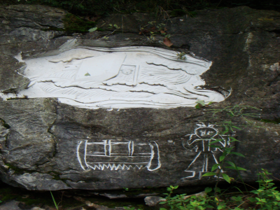 筆者在該村所見的具有“文化生態(tài)村”建設(shè)痕跡,除了村口巨石上鐫刻的文字外,還修建了一條貫通項目組專家們規(guī)劃的“文化生態(tài)展示區(qū)”的石板路,并在作為展示重要文化景觀的地方豎立了介紹或解釋性的文字標(biāo)牌。如,村口、山神廟前、摔跤場等都立有介紹的招牌。讓筆者疑惑和認(rèn)為不應(yīng)該“改造”的是在村民們的祖靈洞巖壁上的“藝術(shù)石刻”(見圖)。從筆者與村民的訪談和項目組的總結(jié)報告資料中,可以把文化生態(tài)村建設(shè)試點項目組在月湖開展的文化保護(hù)工作歸結(jié)為如下幾個方面: