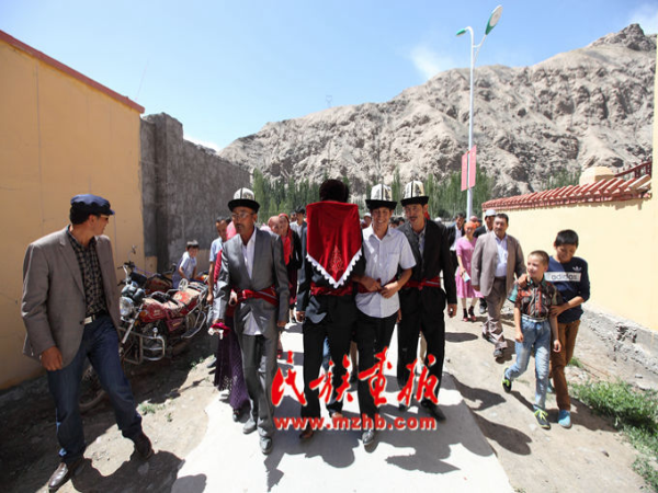 不一會兒,外面熱鬧聲一片。原來是迎親隊(duì)伍來了!只見新郎用一塊紅布遮住了臉,在眾人的簇?fù)硐?,緩慢前行。新郎的左右站了三位伴郎,他們一邊走,一邊唱起柯爾克孜族最具代表性的民間口頭文學(xué)“約隆歌”。每走幾步,新郎都會伴著歌聲的旋律和手勢鞠一下躬。新郎和伴郎腰間各系有一塊紅布,他們邊走,后面幾個新娘家的姐妹就要不時抓住他們腰間的紅布,往后拉一下,盡量不讓他們走得太快。其原因是希望他們多唱歌、多鞠躬,以表達(dá)對女方的尊重。