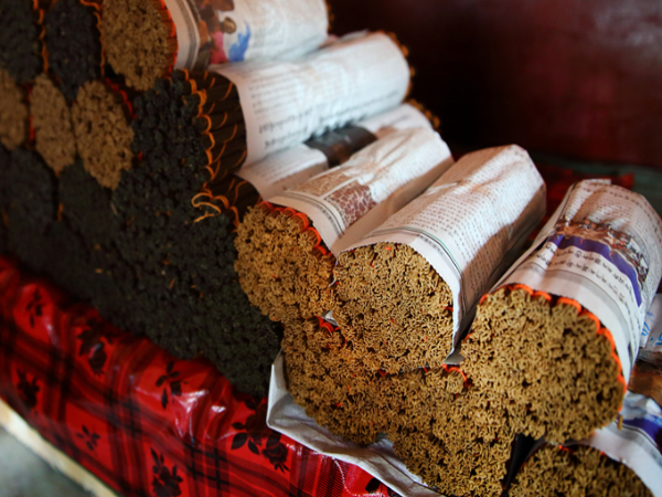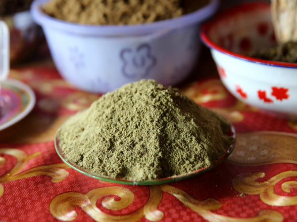 當(dāng)?shù)厝私榻B說(shuō):制作藏香的原材料和制作工序要求極其苛刻。由于藏香最主要的用途是用在宗教禮儀上,所以在制作過(guò)程中要求一切都要以圣潔為主,否則會(huì)被視為是對(duì)神靈的不敬。傳統(tǒng)的藏香原材料繁多而復(fù)雜,一般是柏樹(shù)樹(shù)干為主料,再以藏紅花、麝香、白檀香、紅檀香、紫檀香、沉香、豆蔻、穿山甲、甘菘、冰片、沒(méi)藥等幾十種香料按適當(dāng)比例配合主料搓揉而成。據(jù)了解,用于制作藏香的主料柏樹(shù)干,在吞巴村這樣高海拔的地方并不生長(zhǎng),從古至今,村民都要從400多公里外的林芝縣運(yùn)過(guò)來(lái)了,而制作藏香的部分輔料甚至要從印度引進(jìn)。