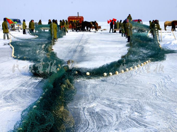 隨著“魚把頭”高亢的號子,馬拉人拽,一張幾千米長的大網(wǎng),被緩緩地拉出冰面。鯉魚、鯽魚、鰱魚、鯰魚等各種魚類一群一群翻上了冰眼。轉(zhuǎn)眼之間,冰面上堆起了一個(gè)個(gè)魚垛。
