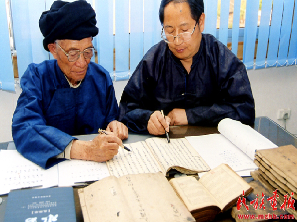韋章炳先生獲得了黔南州首批非物質(zhì)文化遺產(chǎn)傳承人榮譽(yù)稱號(hào),圖為第十三代水書(shū)傳人韋光榮與韋章炳先生一起翻譯水書(shū)