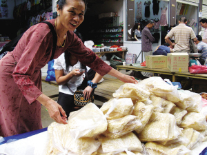 每天清晨,云南西雙版納傣族自治州景洪市嘎灑鎮(zhèn)集貿(mào)市場賣泡牛皮的傣族老咪濤(傣語意為“老阿媽”),都要忙得不亦樂乎。前來購買泡牛皮的餐廳老板絡(luò)繹不絕。因為傣家泡牛皮深受人們的喜愛,近年來,隨著“傣家樂”餐廳如雨后春筍般崛起,賣泡牛皮的老咪濤生意越來越好。
