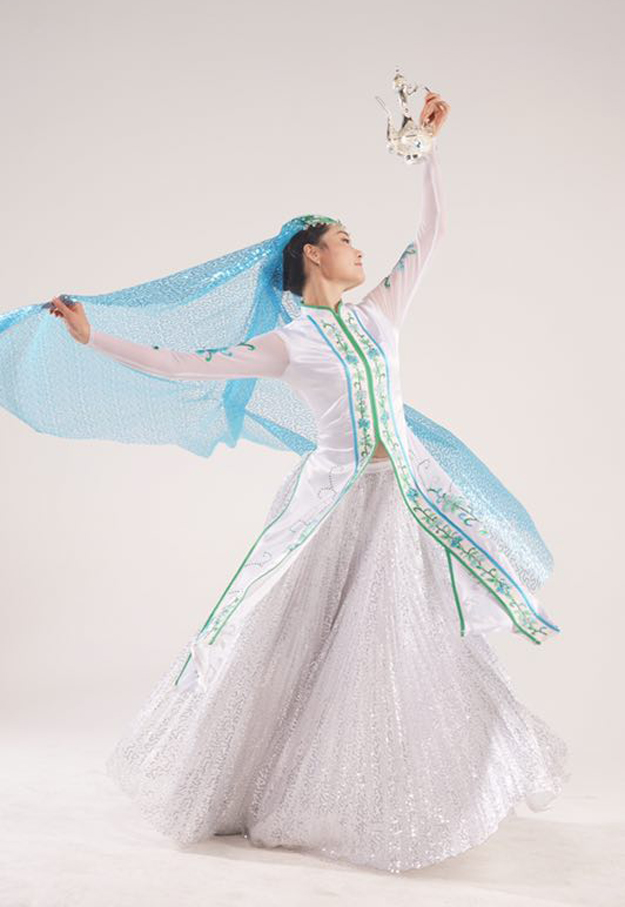 “湯瓶舞”流傳于寧夏回族自治區(qū)。舞者持白毛巾為道具,表現(xiàn)伊斯蘭教禮拜前用“湯瓶”(壺)盛水凈身之習(xí)俗。舞蹈中還常出現(xiàn)模擬“湯瓶”的形象,故有此名。舞蹈有“擦身”“搓背”以及揮舞毛巾互相抽打、嘻戲等動作(圖為手持湯瓶道具,表演回族舞蹈, 舞者娟子本人提供)。