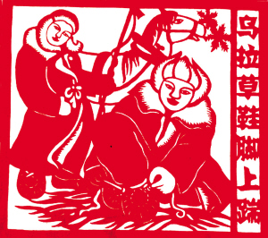 滿族風情剪紙《火盆上炕烤爺太》