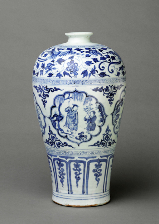 裝飾繁密是典型元青花的重要特點(diǎn),它們由細(xì)巧的文化組成若干條帶環(huán)繞器身,裝飾帶數(shù)量通常很多,但惟獨(dú)沒(méi)有7層的,因?yàn)檫@個(gè)數(shù)字和蒙古族的喪葬與元代的刑罰有關(guān)。相反,9層裝飾帶的元青花卻為數(shù)不少,而這與蒙古族重九顯然有著直接的聯(lián)系【圖為元代后期青花四愛(ài)圖梅瓶。湖北省博物館藏】。