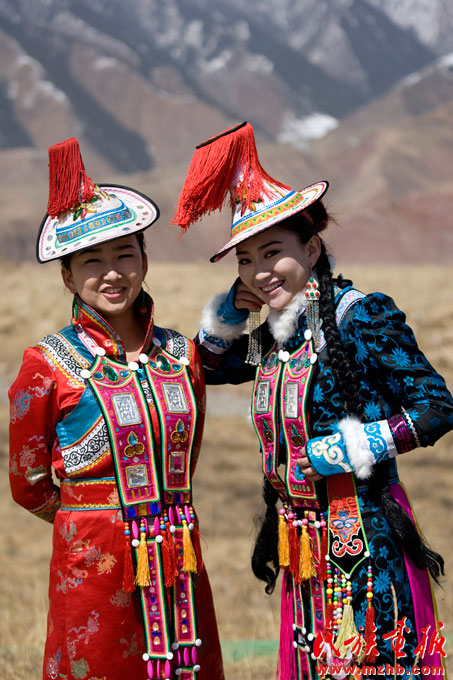 帽子是姑娘和已婚婦女的區(qū)別標(biāo)志。姑娘不戴帽子,前額戴“沙日達(dá)什戈”。這是一條寬約三寸長約一尺,下邊緣用紅色或白色珊瑚小珠穿縫許多珠穗的紅色布帶。已婚婦女身穿高領(lǐng)偏襟長袍,一般由綢、緞、布、褐、皮料縫制。衣領(lǐng)高齊耳根,袍子一般以綠、藍(lán)色為主,但也有深紅、紫紅等顏色。袍子下擺兩邊開衩,衣袖口至肘部用各色織錦緞、彩綢、彩緞花邊一圈圈縫綴裝飾。腰系腰帶(裕固族也叫“胡兒”,即系腰),主要是桃紅色或綠色,長袍上面罩一件高領(lǐng)偏襟坎肩,但也有無領(lǐng)偏襟坎肩。