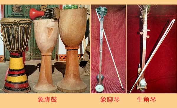 傣劇是在傣族民間歌曲和歌舞音樂的基礎(chǔ)上發(fā)展起來的,并借鑒了漢族戲曲藝術(shù)的表現(xiàn)手段,流傳于德宏、保山、臨滄等傣族聚居區(qū)。傣劇包括多種男女唱腔,男腔多用羽調(diào)式,女腔多用徵調(diào)式。20世紀(jì)50年代以來,傣劇吸收了多種傣族民歌和舞曲,豐富了唱腔,增強(qiáng)了音樂的表現(xiàn)力。傣劇唱腔基本是上下句組成的樂段及其變化反復(fù)。由于唱詞字?jǐn)?shù)可多可少,因此唱腔樂句長(zhǎng)短不一。過去,傣劇只用小堂鼓、鑼、镲等伴奏,后逐步采用了多種民族樂器及西洋管弦樂器,組成新型的傣劇樂隊(duì)。傣族的民族樂器屬于吹奏樂器的有篳、葫蘆簫(如圖)、豎笛、木葉等;彈撥樂器有玎琴、口弦等;弓弦樂器有西玎(玎琴)、牛角玎(牛角琴)等;打擊樂器有象腳鼓、光隆、光邊、光邦、鑼、镲等。象腳鼓、鑼、镲的合奏是傣族器樂合奏的主要形式。