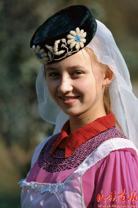 塔塔爾族的婚俗別具一格。按塔塔爾人的傳統(tǒng)習(xí)慣,婚禮在新娘家舉行,即先把新郎“嫁”出去,然后再“娶”回來?;橐鲞^程主要經(jīng)歷提親、相親、訂婚、納聘、嫁新郎、娶新娘六個過程(塔塔爾族少女。引自民族畫報)。