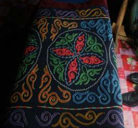北方少數(shù)民族地區(qū)都沒(méi)有養(yǎng)蠶的條件,所以用于刺繡的絲線都需要與中原的物品交流當(dāng)中索取,這也是在蒙藏地區(qū)有用各色的布出現(xiàn)貼花的原因??茽柷哔N花就是把各式各樣布料剪成紋樣貼在布底上再經(jīng)過(guò)縫邊,鎖邊而成的一種刺繡種類(lèi)。這種貼繡在科爾沁蒙古族中是很普及的一種形式。這種貼繡能較好地運(yùn)用大塊面的色彩,用料簡(jiǎn)單,是刺繡中常用的一種方法。科爾沁刺繡在面料上刺繡圖案時(shí)用三種方法,第一種是把刺繡的圖案畫(huà)在紙上在把紙樣按照輪廓剪下來(lái),然后放在要繡的底樣上,按照紙樣的輪廓進(jìn)行刺繡。第二種方法是把圖案如實(shí)地在錦緞上描下來(lái)進(jìn)行刺繡。第三種是直接在錦緞上自由發(fā)揮,繡出各種圖案。