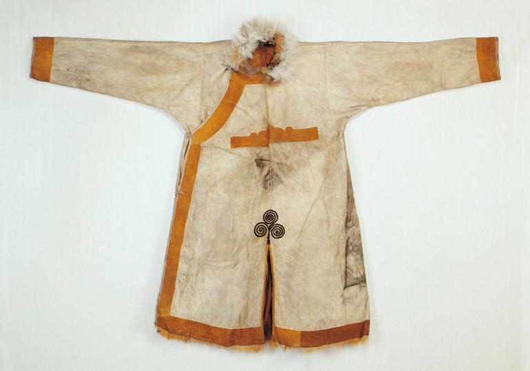 鄂倫春族的傳統(tǒng)服裝以袍式為主,冬季穿“蘇恩”?!疤K恩”是用冬季絨毛狍皮縫制的右任長袍,小立領(lǐng),襟邊、下擺和袖口用黑色皮鑲嵌云卷花紋等邊飾,女袍還要作環(huán)肩裝飾。為便于奔跑和騎馬,“蘇恩”都有開衩,衩口裝飾圖案豐富多彩。夏天穿用夏季沙毛狍皮制作的短袍或坎肩,布匹傳入以后穿布袍。 男子下身穿狍皮短褲,褲腿過膝,樣式如老式免襠褲,后來改穿長褲。出獵時褲子上面還要穿套褲。套褲無襠,呈筒狀,上角釘有皮條,系在腰帶上。一般用夏季的狍皮縫制,因為夏季的狍皮板厚耐磨,也有用鹿皮縫制的。婦女的褲子樣式比較獨特,長至腳面,比男褲瘦些,腰兩側(cè)有開衩,前面有兜肚,兜肚頂端釘皮條,系在脖子上。這樣的褲子,既保暖又便于騎馬,可以護(hù)住前心,又起到了乳罩的作用。講究的人還在褲子兩側(cè)和褲腳處繡上花邊圖案。