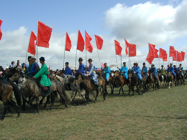 蒙古民族幾乎人人都天生酷愛馬,也很會訓(xùn)練馬,若在過去,作為馬背民族更是離不開馬。好馬、好騎手一直享有極高的榮譽。因此,賽馬當然成為牧民最喜愛的運動。蒙古族賽馬一般分賽走馬和賽奔馬兩種。賽走馬是指讓鞍具齊全并釘有合適馬掌的馬跑對側(cè)步(即前后蹄一順交錯前進),比馬的速度、耐力、穩(wěn)健和美觀。有豐富經(jīng)驗者才能騎出走馬來,所以,參賽的馬多用5歲以上的成年馬,騎手也以成年人為主。比賽時,要求騎手有高超的騎術(shù),能夠駕馭好馬,使其既走得快、穩(wěn)、美,又不能跑起來。還要求馬抬步越高越好,這樣顯得很有“風(fēng)度”,這不僅取決于馬掌的重量,還要看馬的素質(zhì)。一匹好的走馬,即便在牧區(qū)也價格非常昂貴。賽奔馬是比馬的速度和耐力,以先到達終點者為勝。奔馬的步伐與走馬不同,是四蹄分前后成雙交錯奔跑。參賽的選手多為十二三歲的小男孩,因為他們體輕敏捷。為了減輕馬的負荷和照顧騎手的安全,奔馬都不備鞍具或配備輕巧的鞍具。騎手們只穿華麗的彩衣,頭束紅綠飄帶,顯得英武、神氣。賽程一般長25至35千米。奔馬賽比走馬賽普遍,參賽的人數(shù)也多,少則幾十,多則逾百。比賽開始,選手們迅速躍馬,揚鞭飛奔,觀眾則雀躍歡呼,吶喊助威【圖為馬隊進場儀式,劉軍攝影】。