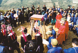 寨子里響起了鞭炮聲,整個(gè)寨子都熱鬧起來。師父們帶著助手前往弟子家主持儀式。即將受戒的十多個(gè)男孩分坐兩排,前排的用被子蒙著頭,后排的帶著草帽,不讓人看見他們的臉。在歌手的歌聲和樂聲中,開始了一項(xiàng)項(xiàng)受戒儀式。從天明到黑夜都在不停地進(jìn)行著。