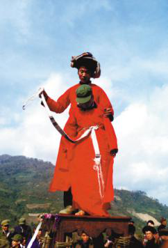 “跳五臺”可算是儀式中較為引人注目的。在村邊的一塊場地中央搭好一座約兩米高的木臺,叫做“五臺”。受戒的弟子們同樣帶著草帽,身穿紅袍,由師父帶領(lǐng)走向五臺。在鑼鼓聲中,繞五臺三圈,繞畢盤腿坐好。師傅叫到誰,誰就起來,在師父的指引下,沿木梯爬上高臺。蹲在五臺上的受戒者,雙手十指交錯(cuò),小心翼翼地向后移動到桌邊,然后翻落于藤網(wǎng)之中,由網(wǎng)中的棉被將受戒者包住。師父掀開棉被,見受戒者十指仍然穩(wěn)扣,坐像端端正正,表示度戒成功。十幾位弟子輪番上臺,每位都順利通過。受戒弟子的父母和鄉(xiāng)親們都為他們的成功而歡喜。