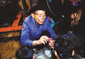這天,我們剛好在縣里采訪,聽說高良鄉(xiāng)瑤族村寨要舉行度戒活動,于是就直奔瑤寨而去。一進(jìn)寨子,馬上感覺氣氛不同。瑤族婦女們頭戴別致的大銀盤,身著盛裝,真像過節(jié)一樣。經(jīng)了解后,得知寨子里共有十幾個(gè)男孩要參加這次度戒。寨子里的一位老人告訴我們,一般情況下,只是兩三人,這樣多的男孩一同舉行度戒儀式是很難碰到的??磥?,我們的運(yùn)氣還真不錯(cuò)。我們來到度戒地點(diǎn),見到將要度戒的十幾個(gè)男孩集中在一起,用棉被蒙著頭,不能見陽光,要等儀式完后,才能見陽光。