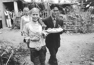 上午10點(diǎn),新娘要“回返”娘家。伴娘挑著兩只籮筐,一邊放有糯米和豬肉,另一邊放著一件衣服。這件衣服只能是黑色或藍(lán)色,不能是花色和白色。據(jù)說(shuō)花衣服新娘穿了會(huì)花心,白色則不吉利。這件衣服是婆婆特地送給新娘的,今后一定要穿。新娘和伴娘一起走在回返的路上,新娘舍不得離開(kāi)婆家,走到村口,就把糯米飯和豬肉分給過(guò)路人吃,以示新娘的熱情好客。我也吃了籮筐里的糯米飯和豬肉,覺(jué)得很香,很好吃。之后,新娘和伴娘不再往娘家走,而是返回了婆家。