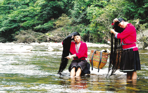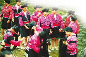 紅瑤女子的長發(fā)平均在1.4米以上。村寨前后的河灘邊、泉水邊,就是她們的天然梳妝臺