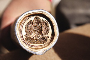 制作帕肯的材料五花八門,有泥土、經(jīng)書粉、藥材、香灰、花粉、玻璃纖維、高僧骨灰、圣物、貝殼粉、橡膠、金銀、管符(一種寫有經(jīng)咒的金屬細(xì)管)、珍貴帕肯磨成的粉末……選擇它們其中的一些混合在一起,就可以制作不同的帕肯了。近20年來(lái),大量金屬帕肯出現(xiàn),現(xiàn)在基本占到了帕肯總量的一半。大致會(huì)有金、銀、銅、五合金、九合金、礦石合金等6種金屬會(huì)被使用到帕肯制作中。金屬帕肯可以制作得更精細(xì)、保存時(shí)間更長(zhǎng)久。