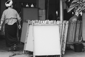 澆紙是在紙槽中進(jìn)行的,不但需要強(qiáng)勁的臂力,還需要相當(dāng)?shù)募?xì)心。在紙槽中舀水的時(shí)候,雙臂承受的重量不下10公斤,紙要澆得恰到好處,澆輕了紙就太薄,澆重了紙又太厚。太薄出不了好品相,太厚會(huì)增加成本。這是整個(gè)構(gòu)紙成品的關(guān)鍵,經(jīng)驗(yàn)老到的傣族老人,都不會(huì)在這道工序上馬虎。一雙手游走在澆紙槽,或輕輕拍打,或慢慢游弋,絮狀的纖維時(shí)而附著在手上,時(shí)而又歡呼雀躍地散開,頑皮得有點(diǎn)像芒團(tuán)村水塘邊遇上的那些孩子。憑感覺均勻了,老人這才輕輕將澆紙盤脫離水面,一眨眼功夫,一張構(gòu)紙便在盤上現(xiàn)出端倪。接下來的事就交給陽(yáng)光了,如果雨季來臨,構(gòu)紙就停止生產(chǎn)。所以說,芒團(tuán)構(gòu)紙常常浸漬著一種陽(yáng)光的味道。