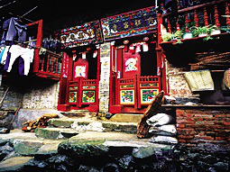 狹長式的房屋大都建在深山里幾十戶大小的村寨。面闊一間并開正門,室內(nèi)隔間向縱深排列,從正門到后門有7道門之多。正門是大門也是第一道門,是家族的門面,被視為招財進寶和迎接貴客之門。對開門扇高大厚實,門檻上又設(shè)兩扇雕刻彩繪的矮門,天熱開大門通風時,可以防止禽畜入戶。大門兩側(cè)掛有木刻大字對聯(lián),大門墻面的屋檐下則畫有七彩畫卷。