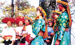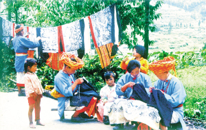 這是一個特別愛美的民族。男人們著裝瀟灑隨意,頭纏黑白相間的方格頭帕,倍顯英俊。女人們則身穿黛藍色對襟長衫,鑲著的紅布邊和紅布扣純?yōu)檠b飾。下著素艷相融的花裹裙,腰纏五顏六色的腰帶,頭上再配一個后面吊有長長彩須、狀似倒扣斗篷的火紅頭巾,把個茫茫綠野點綴得山花爛漫、如畫如詩。