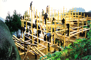 花瑤同胞修建新屋,至今沿襲著奇特古老的巫風(fēng)。對于宅基地的選擇要請地仙擇地,幫助選向和挑選動工日期。待三柱或五柱一扇的木架子做好后,豎架上梁的那天,全寨的親鄰都會主動來幫忙。用繩子拉的、用叉子撐的、用肩膀頂?shù)?、用木槌敲的、用雙手推的,各居各位后,一聲喊起,—扇木架瞬間立于宅基上了。