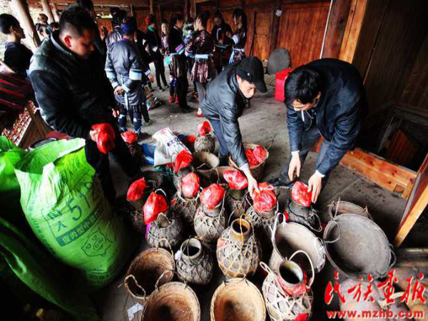 這次結(jié)婚的共有15對(duì)新人(多時(shí)有二三十對(duì)),均來(lái)自本寨的青年男女?;槎Y從大年二十六開始,共進(jìn)行三天,在三天的婚禮中新郎新娘家均有婚宴,尤以第一天中午的規(guī)模最大也最為隆重。