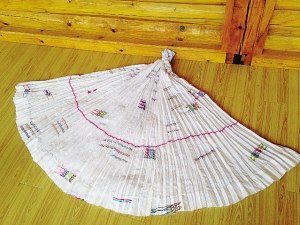 摩梭傳統(tǒng)手工百褶裙 阿七獨(dú)支瑪(參展人): 媽媽把許多古老的摩梭圖案編進(jìn)裙布里,并在裙布下方織一條不接頭的紅線,代表生命的輪回,這是摩梭人的一種人生觀。摩梭女性穿的裙子是百褶裙,媽媽編織好圖案及棉布衣后,還要再一個(gè)一個(gè)地縫上褶線,雖然很花工夫,但制作衣服的時(shí)候,是我見過(guò)的媽媽最開心的時(shí)候。
