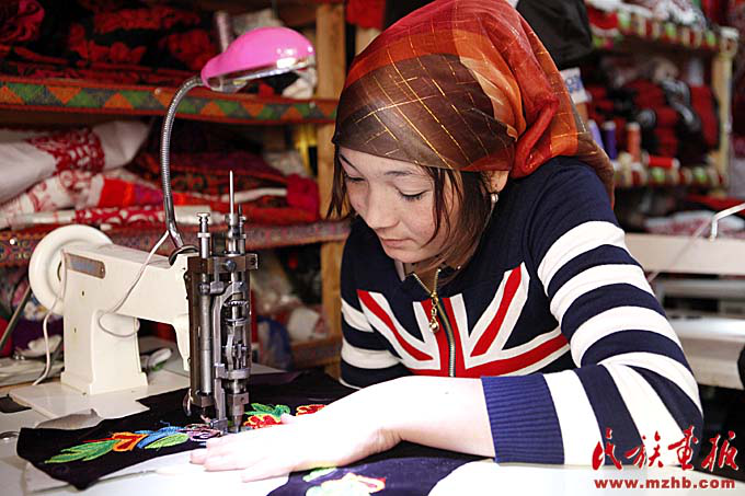 克孜勒陶鄉(xiāng)婦女手工藝刺繡合作社。手工刺繡業(yè)成為克孜勒陶鄉(xiāng)農牧民增收的一個渠道