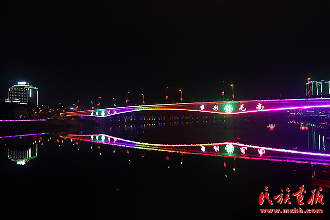 11月9日通車的環(huán)江三橋不僅便利了交通,橋上的霓虹燈把夜色中的毛南山鄉(xiāng)裝點(diǎn)地非常美麗