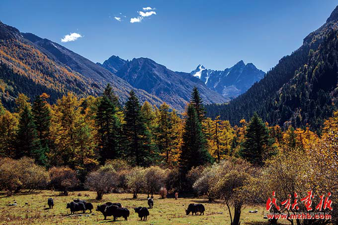 甘孜州的藍(lán)天白云、安詳牧群,金黃色西洋油畫般的美景吸引著八方游人(民族畫報社 列來拉杜攝影)