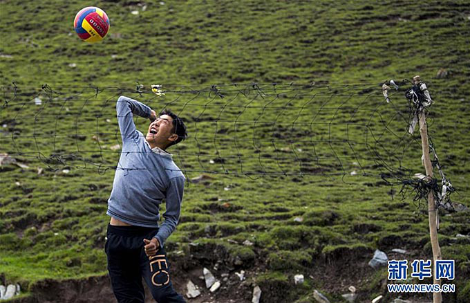 開(kāi)學(xué)就該上高三的喀拉塔什其木干村村民圖潤(rùn)塔依·艾沙買(mǎi)買(mǎi)提用木棍和簡(jiǎn)易的網(wǎng)子在家門(mén)口的空地上劃了一塊排球場(chǎng)