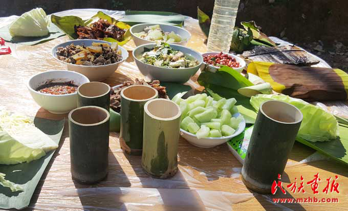 基諾族地區(qū)食材豐富,一日三餐,以大米為日常主食,雜以玉米、瓜豆等。每年5—9月的雨季,基諾山漫山遍野是食材,山藥、水芹菜、竹筍、魚腥草及各種菌類等無污染且很新鮮,是難得的烹飪材料,經(jīng)過簡(jiǎn)單處理就成為餐桌上的美味佳肴?;Z族民間有句俗話,叫“漢炒、傣蘸、基諾舂”,也就是說漢族人喜歡吃炒菜,傣族的菜喜歡蘸著調(diào)料吃,基諾族的菜則以臼舂為主?;Z族的肉類的吃法較多,可以腌成干巴,也可吃新鮮的。酸腌魚、涼拌茶也是基諾族的最愛,基諾人做飯就餐均在竹樓二層的火塘周圍進(jìn)行,有一定的禮節(jié)和講究。基諾族吃飯時(shí),主人首先要在火塘東側(cè)獻(xiàn)一點(diǎn)飯菜祭祀祖先和灶神,吃飯時(shí)全家人按順序在火塘旁圍蔑桌而坐,家長(zhǎng)正對(duì)火塘,客人靠火塘而坐。