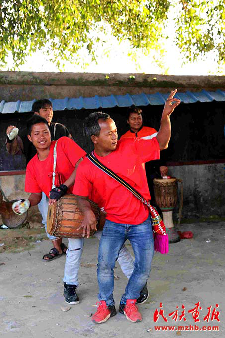 沿著曲折的山路開(kāi)車一個(gè)多小時(shí),記者來(lái)到西盟縣秧洛村一組,恰巧碰到了一對(duì)新人喜結(jié)良緣。清脆的木鼓聲在大山里回蕩,秧洛村的村民喝喜酒、跳木鼓舞。