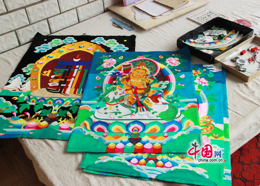 堆繡的工序一般有圖案設(shè)計、剪裁、堆貼、繡制,個別圖案部分上色等。堆繡先按規(guī)范的佛畫繪成畫稿,再按佛像不同部位的要求選用各色面料,剪貼縫制而成。小幅畫面為一尊主佛像與下方兩尊小佛像組成,周圍配以花卉、云紋、日月、供品等圖案。與傳統(tǒng)的唐卡不同,堆繡工藝品是用各色棉布、綢、緞剪成所設(shè)計的各種圖案形狀,精心堆貼成一個完整的畫面。其工序有圖案設(shè)計、剪裁、堆貼及個別圖案部分上色等。一般來講,圖案設(shè)計環(huán)節(jié)主要以客人需求為主。勾草圖最能考量藝人繪畫技能,也是至關(guān)重要的步驟。圖案設(shè)計完成后,將各色布料比照圖案剪裁、粘好,之后再填充以羊毛或棉花等,以使圖案凸起,最后將各色布料圖案堆貼在設(shè)計好的大幅布幔上,構(gòu)成一組完整的畫面,達到靜中有動、生動傳神、惟妙惟肖的境地。使畫面產(chǎn)生豐富生動的立體感和織物特有的肌理感,達到淺浮雕式的藝術(shù)效果,表現(xiàn)力豐富。作品粗獷中顯細(xì)膩,點滴中見絕妙,技藝精湛,巧奪天工。一幅堆繡可以說是一幅絲質(zhì)的彩色浮雕作品,極具藝術(shù)觀賞價值。