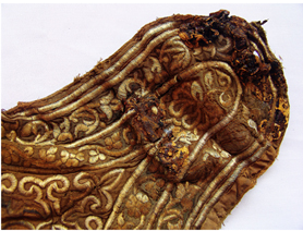 我們?cè)?jīng)描述過(guò)元代納石失生產(chǎn)的空前絕后。蒙古民族把對(duì)于黃金的寶愛,傾泄進(jìn)元朝一百年的歷史時(shí)空。在整個(gè)13世紀(jì)的每一個(gè)歷史篇章,都鐫刻著納石失的金縷光影。我們?cè)谑妨侠锟吹?,天子之衣是納石失,天子之裳是納石失,天子之履依然是納石失。那么,蒙元一代,還有什么是用黃金絲線耗盡心血織繡而成的呢?現(xiàn)在,我們看到了這只金繡弓囊。