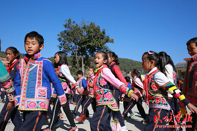 邊唱邊跳三弦舞的彝族學(xué)生們