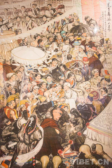 鑒賞展現(xiàn)場,不少前來參觀的畫家都是韓書力的學(xué)生或在一定時(shí)期曾受其教導(dǎo)?!?973年,我在西藏自治區(qū)展覽館見到了韓書力老師,第一次見面我就拜了師。我們一起下鄉(xiāng),我就給他當(dāng)導(dǎo)游和翻譯。30幾年來,我一直在學(xué)習(xí)韓老師的繪畫技法,到現(xiàn)在還是他的學(xué)生。韓老師創(chuàng)作《毛主席派人來》時(shí),我就跟在旁邊學(xué)習(xí)。學(xué)到了一些創(chuàng)作獨(dú)幅作品的技巧和手法,讓我受用至今?!蔽鞑厍嗄戤嫾矣?jì)美赤列說。