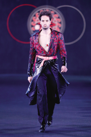 課題組將彝族銀飾經(jīng)典的浮雕圖案元素、彝族畢摩繪畫和文字元素、彝族服飾傳統(tǒng)紋樣圖案元素、彝族鸚嘴帽元素、朵洛荷舞蹈元素、察爾瓦流蘇元素等融入到作品中,沿用傳統(tǒng)民族服裝的色調,并對圖案和造型進行現(xiàn)代設計和審美的轉化與提升,傳統(tǒng)服飾與現(xiàn)代創(chuàng)新設計相結合,碰撞出了新的時尚美感。