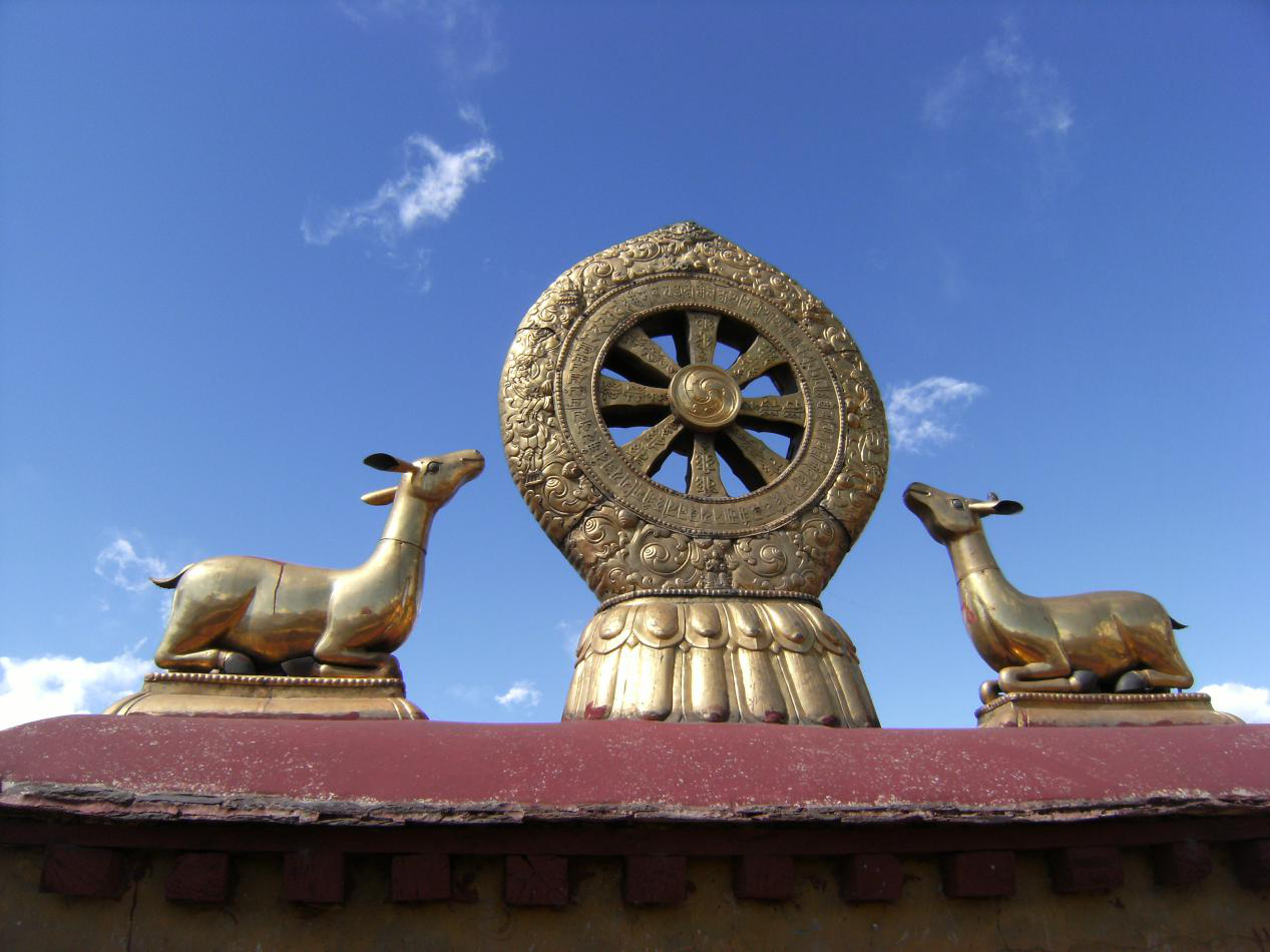 全寺坐東朝西,建筑具唐代風(fēng)格,有高四層的銅質(zhì)鎦金樓閣五座、殿堂數(shù)十間。正殿供奉文成公主從長安帶往的釋迦牟尼像,像前擺放十二盞金燈。各殿有松贊干布、文成公主、墀尊公主的塑像及佛像、祖師塑像,還有壁畫眾多。珍藏有七世紀以來的歷代文物。