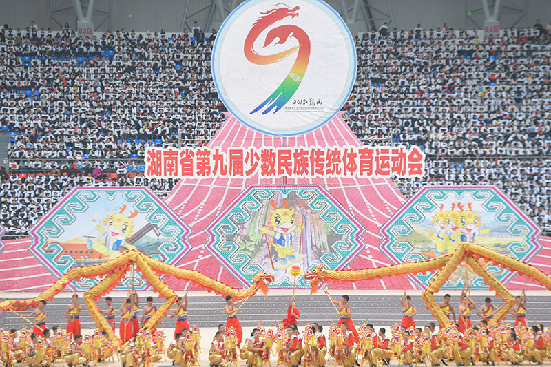 金風(fēng)送爽,丹桂飄香。10月16日至20日,湖南省第九屆少數(shù)民族傳統(tǒng)體育運(yùn)動(dòng)會(huì)在龍山縣舉行。本屆運(yùn)動(dòng)會(huì)以“龍山緣·民族情·中國(guó)夢(mèng)”為主題,由省民宗委、省體育局、湘西州人民政府主辦,龍山縣人民政府承辦,共有來自湖南省14個(gè)市州和17個(gè)民族縣市區(qū)組成的31個(gè)代表團(tuán)2631人參加,是湖南省歷屆少數(shù)民族傳統(tǒng)體育運(yùn)動(dòng)會(huì)規(guī)模最大、規(guī)格最高、參賽人數(shù)最多的一次。運(yùn)動(dòng)會(huì)期間,來自土家、苗、瑤、侗、白、維吾爾、壯、回、漢等22個(gè)民族的1991名運(yùn)動(dòng)健兒角逐高腳、秋千、板鞋競(jìng)速、射弩、陀螺、蹴球、押加、毽球以及民族健身操9大項(xiàng)60個(gè)小項(xiàng)的競(jìng)賽項(xiàng)目以及55個(gè)表演項(xiàng)目。