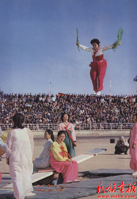 1982年9月2日至8日,第二屆全國少數(shù)民族傳統(tǒng)體育運動會在內(nèi)蒙古呼和浩特舉行,圖為朝鮮族婦女展示傳統(tǒng)游戲項目——跳板。全國少數(shù)民族傳統(tǒng)體育運動會發(fā)掘了一大批新項目,并在探索普及與提高結(jié)合、群眾性與專業(yè)化結(jié)合、傳統(tǒng)體育與現(xiàn)代體育結(jié)合、民族性與世界性結(jié)合的道路上取得了可喜的進(jìn)步,使少數(shù)民族傳統(tǒng)體育走上了普及、提高、規(guī)范、科學(xué)的道路。目前全國少數(shù)民族傳統(tǒng)體育運動會已經(jīng)舉辦了十屆《民族畫報》1982年第12期