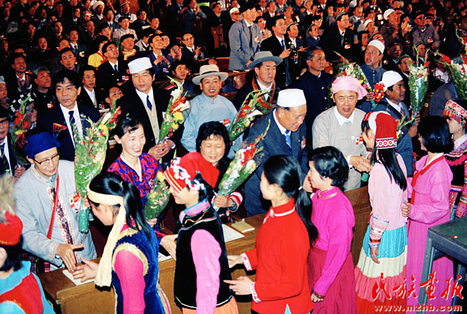 1988年4月25日至29日,首次全國民族團(tuán)結(jié)進(jìn)步表彰大會在北京舉行,圖為大會現(xiàn)場.《民族畫報》1988年第8期