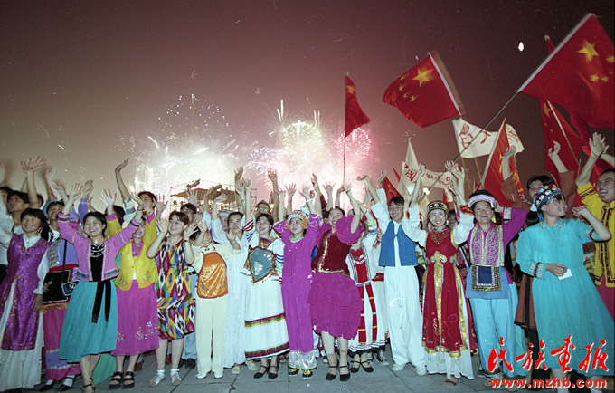 1997年7月1日零點,中華人民共和國國旗和香港特別行政區(qū)區(qū)旗在香港升起,經(jīng)歷了百年滄桑的香港回到祖國的懷抱,中國政府開始對香港恢復(fù)行使主權(quán)。香港回歸祖國,舉國上下一片歡騰。各族人民以隆重而熱烈的方式,歡呼五星紅旗在香港特別行政區(qū)高高飄揚。圖為首都各民族學(xué)生熱烈慶祝香港回歸。《民族畫報》1997年第9期