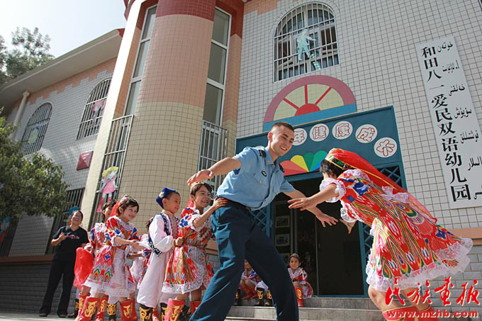 民族團(tuán)結(jié)是國家統(tǒng)一、繁榮昌盛的前提和保證,各民族“共同團(tuán)結(jié)奮斗,共同繁榮發(fā)展”是我國民族工作的主題。全國各地扎實開展民族團(tuán)結(jié)進(jìn)步創(chuàng)建工作,平等團(tuán)結(jié)互助和諧的社會主義民族關(guān)系進(jìn)一步鞏固和發(fā)展。2011年,空軍駐新疆和田某指揮所首次投資80萬元,開辦了和田八一愛民雙語幼兒園,讓30個家庭的孩子進(jìn)入雙語班成為首批“藍(lán)天春蕾兒童”。圖為維吾爾族戰(zhàn)士艾力夏提和該園兒童一起玩老鷹捉小雞游戲?!睹褡瀹媹蟆?011年第11期