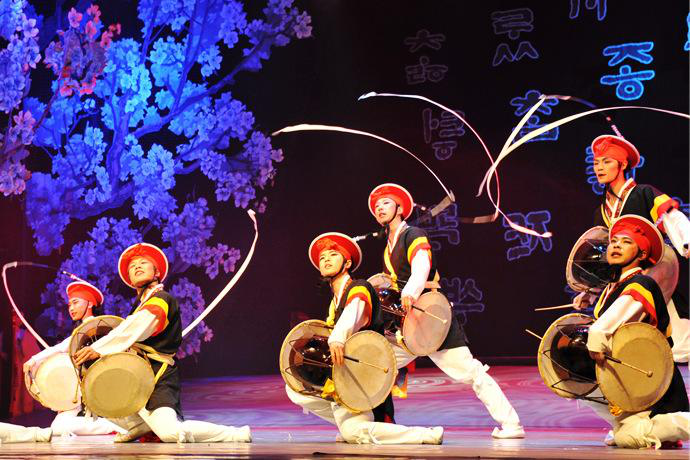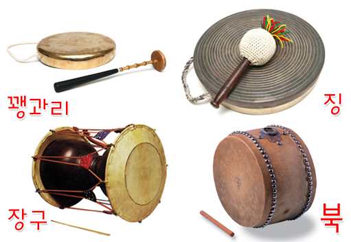“四物樂”,朝鮮語為????。四物樂是由韓國(guó)著名民俗家沈雨晟先生命名的,20世紀(jì)90年代傳入我國(guó)吉林延邊朝鮮族自治州。“四物樂”由小鑼(???)、鑼(?)、長(zhǎng)鼓(??)、圓鼓(?)四種樂器演奏音樂,并且由此音樂來做游戲。每種樂器都是以大自然的聲音來形成的。小鑼象征風(fēng),長(zhǎng)鼓象征雨,圓鼓象征雷,鑼象征電。