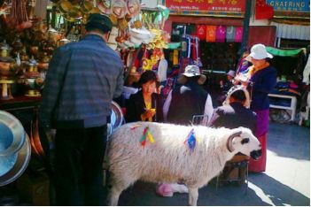 在西藏的許多寺廟及附近,常常會(huì)有單獨(dú)的、或三三兩兩的脖頸上系著紅布條沒(méi)有主人的羊只。主人把它們放生,使它們重歸自然,成為自由的羊,免去了挨宰遭殺之罪。習(xí)慣上,這些羊就叫做放生羊。轉(zhuǎn)經(jīng)人會(huì)自覺(jué)自愿給它們吃的東西,它們不會(huì)為肚子饑餓而亂躥。也許正因?yàn)槿绱耍@些放生羊才會(huì)顯得非常乖巧溫順。