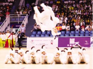 ?、咴颇详犨x手在陀螺男子團體賽中郭浩攝
